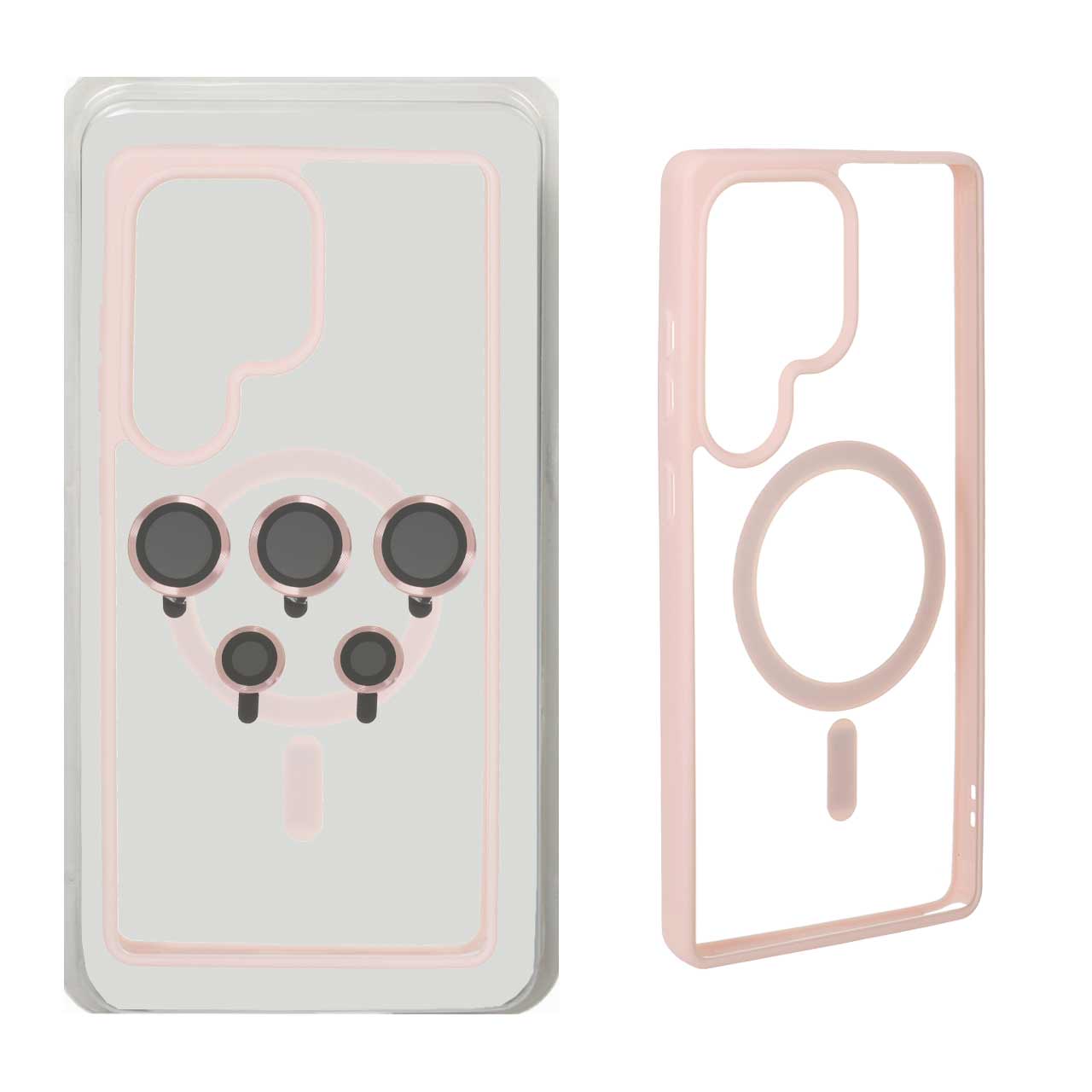 قاب Magnetic شفاف MagSafe با ست محافظ لنز رینگی Samsung Galaxy S25 Ultra - صورتی روشن (پک دار)