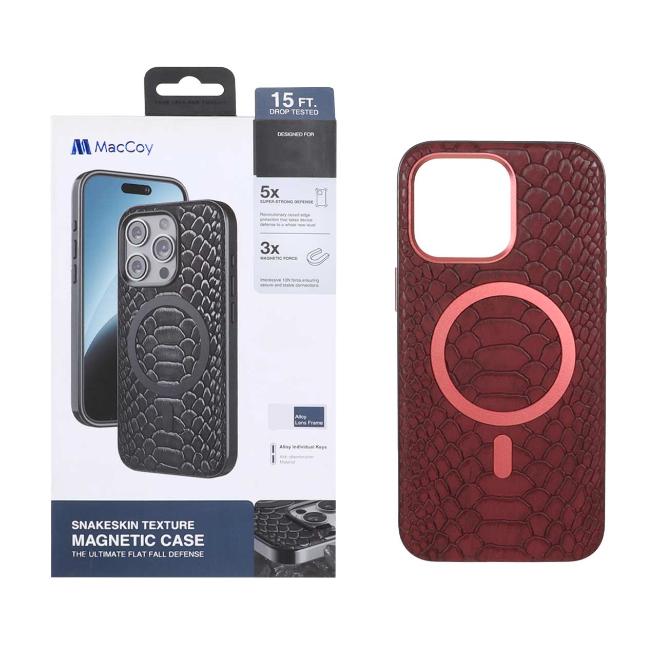 قاب اورجینال MacCoy چرمی پوست ماری MagSafe مدل Apple iPhone 15 Pro Max - زرشکی (پک دار)
