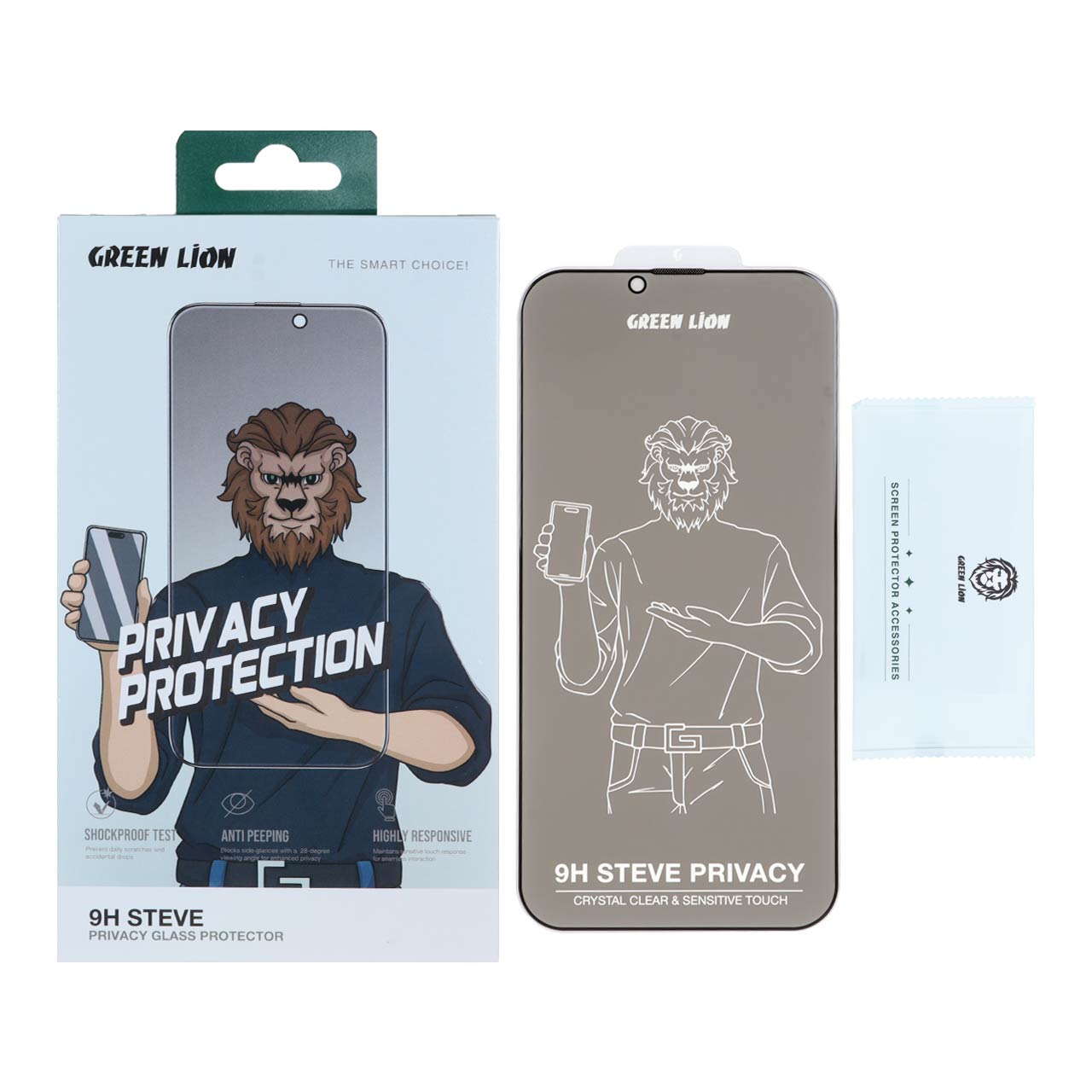 محافظ صفحه نمایش شیشه ای اورجینال Green Lion Steve Privacy مدل Apple iPhone 13 / iPhone 13 Pro / iPhone 14 / iPhone 16e (پک دار)