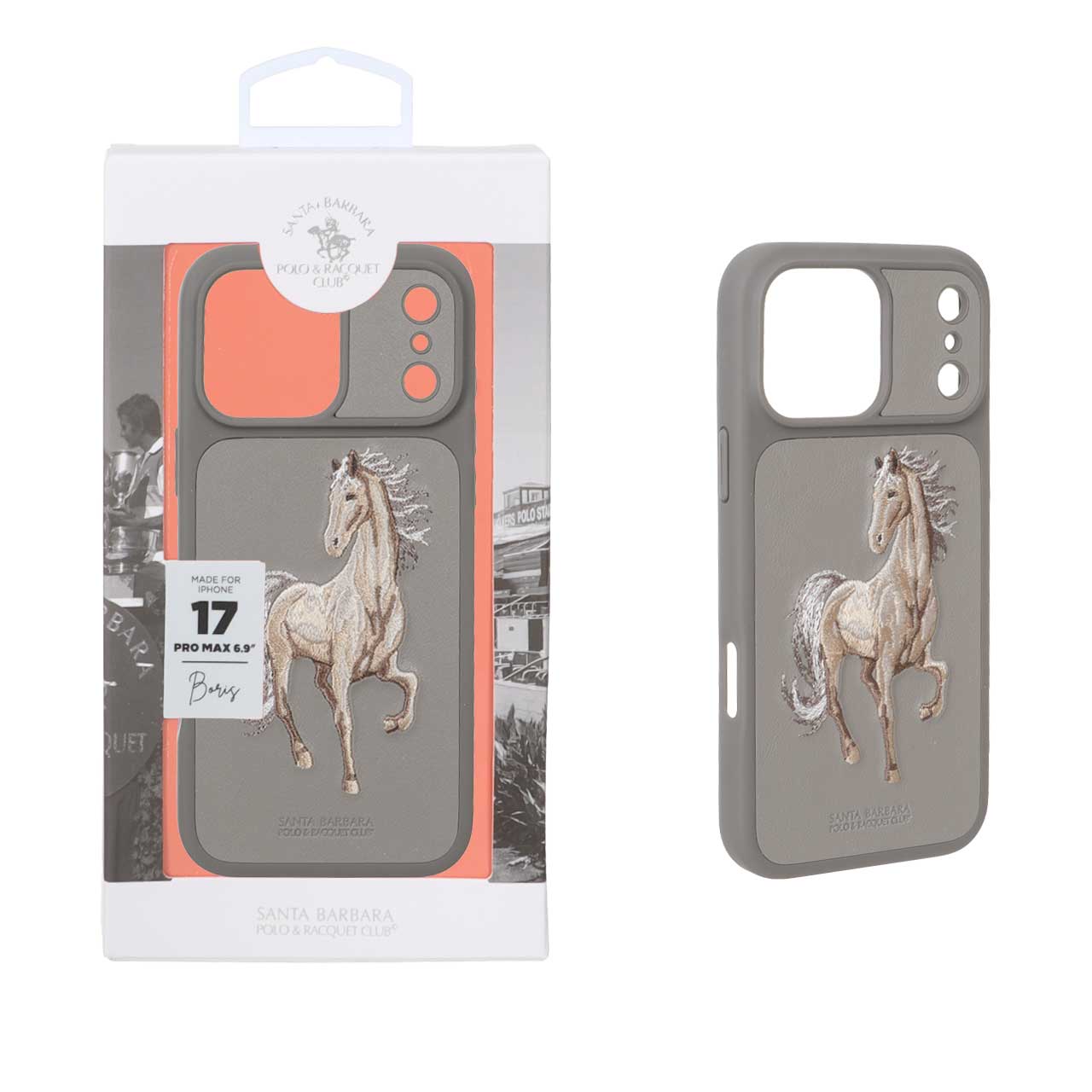 قاب اورجینال Polo Santa Barbara چرمی گلدوزی Apple iPhone 17 Pro Max - طوسی (پک دار)