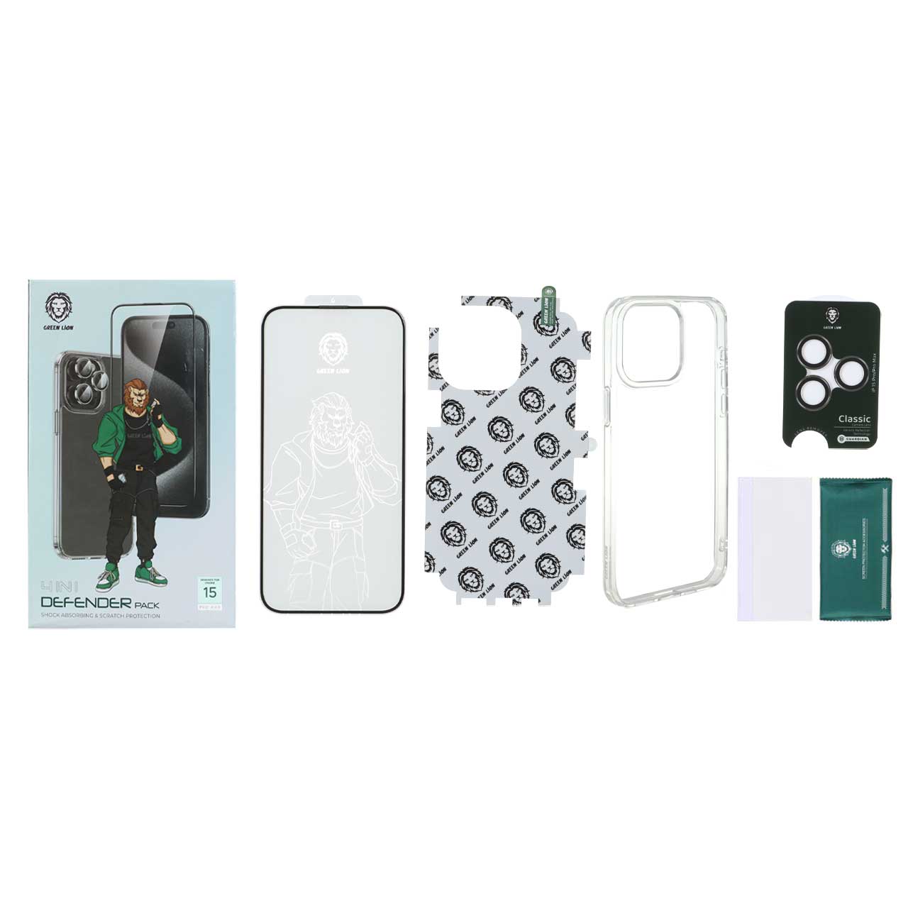 قاب اورجینال Green Lion 4IN1 با ست برچسب پشت و محافظ لنز و صفحه نمایش Privcay مدل Apple iPhone 15 Pro Max - مشکی (پک دار)