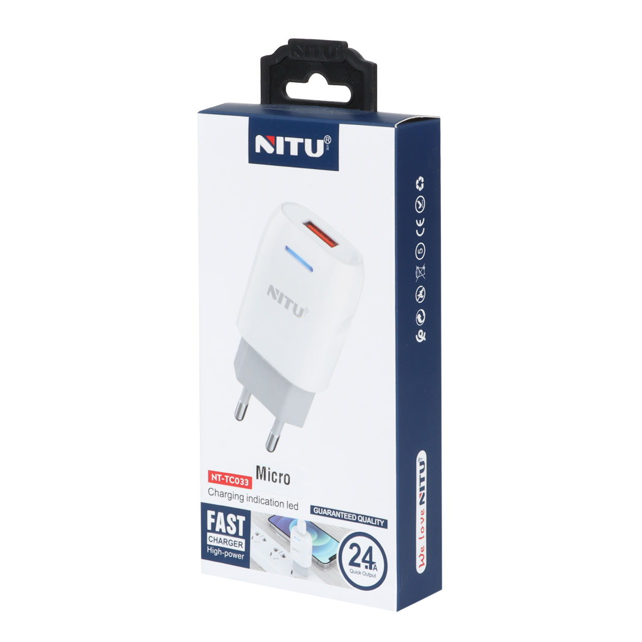 شارژر دیواری فست تک پورت Nitu مدل NT-TC033 به همراه کابل شارژ اندروید - سفید (گارانتی 18 ماه تعویض نیکان همراه)