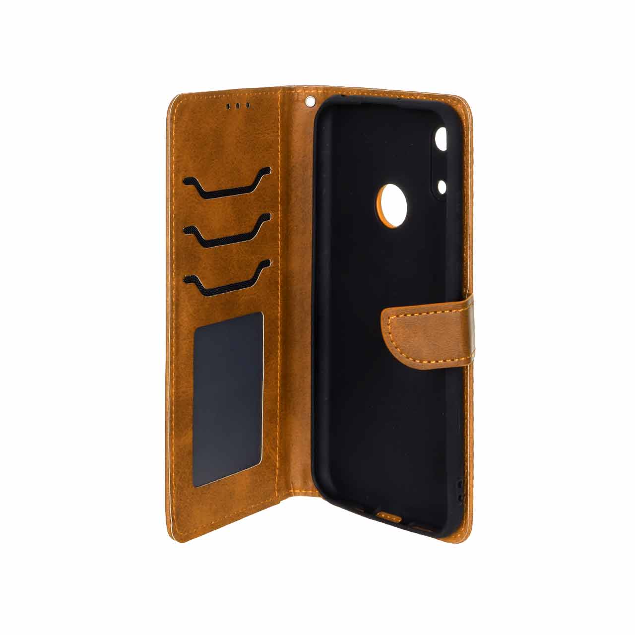 کیف چرمی موبایل مگنتی محافظ لنزدار Huawei Y6 (2019) / Y6 Prime (2019) / Y6s / Honor 8a - عسلی